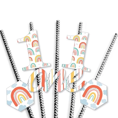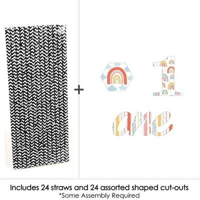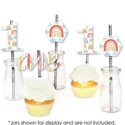 Hello Rainbow Straw Decor INCLUDES 24 Boho Rainbow paper cut outs, 24 coordinating paper straws, and 40 clear stickers for easy assembly. Hello Rainbow DIY party supplies are perfect for a 1st Birthday Party. Boho Rainbow Straw Decor party kit SIZE: 8 – Boho Rainbow shape 1 paper die cuts (2″ x 2.75″), 8 – Boho Rainbow shape 2 paper die cuts (4.25″ x 1.75″), 8 – Boho Rainbow shape 3 paper die cuts (2.25″ x 2″), and 24 chevron striped paper straws 7.75″ tall. EASY PARTY DECORATIONS: Hello Rainbow straw decor will add a touch of style to your First Birthday Party tables. Boho Rainbow straw decor will also look great at your beverage bar. Use these adorable Boho Rainbow party accessories as straws or swizzle sticks. The paper straws can also be cut in half and used as cupcake picks once the shaped cut out is attached. PREMIUM PARTY SUPPLIES: Hello Rainbow paper cut out straw decorations are professionally printed on heavy-duty cardstock paper with a photo-like shine. They are individually inspected and carefully packaged by hand, along with coordinating paper straws. Boho Rainbow Straw Decor will require some easy assembly. Simply adhere the shaped cut outs to the straws using the included clear stickers. Get creative with your DIY 1st Birthday Party decoration ideas! MADE IN THE USA: Hello Rainbow – 1st Birthday Party Paper Straw Decor Striped Decorative Straws are designed and manufactured at our Wisconsin facility using materials that are Made in America. Please Note: Mason Jars shown for display purposes and are not included.