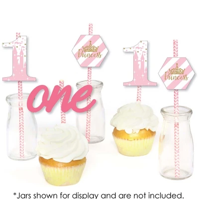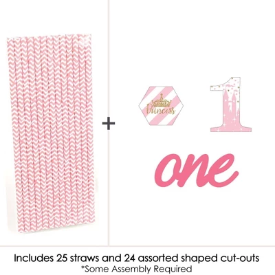 1st Birthday Little Princess Crown Straw Decor INCLUDES 24 paper cut outs, 24 coordinating paper straws & 40 clear stickers for easy assembly. 1st Birthday Little Princess Crown DIY party supplies are perfect for a first birthday party. Princess First Birthday Straw Decor party kit SIZE 8 # one 2″ wide x 2.75″ tall; 8 one (words) 4.25″ wide x 1.75″ tall; 8 hexagon 2.25″ wide x 2″ tall; and 24 chevron striped paper straws 7.75″ tall. EASY PARTY DECORATIONS: 1st Birthday Little Princess Crown straw decor will add a touch of charm to your birthday party tables. Princess 1st bday straw decor will also look great at your beverage bar. Use these adorable princess birthday party accessories as straws or swizzle sticks. The paper straws can also be cut in half and used as cupcake picks once the shaped cut out is attached. PREMIUM PARTY SUPPLIES: 1st Birthday Little Princess Crown paper cut out straw decorations are professionally printed on heavy-duty card stock paper with a photo-like shine. They are individually inspected and carefully packaged by hand, along with coordinating paper straws. 1st Birthday Little Princess Crown Straw Decor will require some easy assembly. Simply adhere the shaped cut outs to the straws using the included clear stickers. Please Note: Mason Jars shown for display purposes and are not included. Little Princess Crown – Striped Decorative Straws use a No-Mess Glitter Print: Our wrappers are designed with a printed image of glitter, eliminating glitter flake while maximizing bling effect!