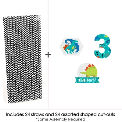 3rd Birthday Roar Dinosaur Straw Decor INCLUDES: 24 Three Rex Boy Dino paper cut outs, 24 coordinating paper straws, and 40 clear stickers for easy assembly. 3rd Birthday Roar Dinosaur DIY party supplies are perfect for a Third Birthday Party. Three Rex Boy Dino Straw Decor Party Kit SIZE 8 – “Dino Mite!” Shapes (2.75 inches x 2.25 inches), 8 – “3” Shapes (2 inches x 2.75 inches), 8 – Hexagon Shapes (2.75 inches x 2 inches), and 24 chevron striped paper straws 7.75″ tall. EASY PARTY DECORATIONS: 3rd Birthday Roar Dinosaur straw decor will add a touch of style to your Third Birthday Party tables. Three Rex Boy Dino straw decor will also look great at your beverage bar. Use these adorable Dinosaur party accessories as straws or swizzle sticks. The paper straws can also be cut in half and used as cupcake picks once the shaped cut out is attached. PREMIUM PARTY SUPPLIES: 3rd Birthday Roar Dinosaur paper cut out straw decorations are professionally printed on heavy-duty cardstock paper with a photo-like shine. They are individually inspected and carefully packaged by hand, along with coordinating paper straws. Three Rex Boy Dino Straw Decor will require some easy assembly. Simply adhere the shaped cut outs to the straws using the included clear stickers. Get creative with your DIY Third Birthday Party decoration ideas! Please Note: Mason Jars shown for display purposes and are not included.