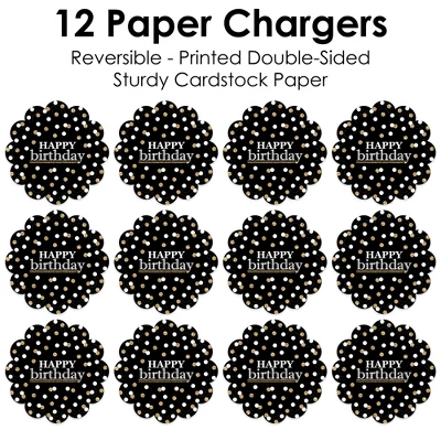 Adult Birthday Paper Chargers INCLUDES set of 12 reversible round table decorations. Create an exciting look at your Birthday Party when you use paper chargers to elevate your table setting and accent your dinnerware. Tablescape Accent: Adult Birthday chargers will add a festive flare to your tablescape. Whether it’s a large feast gathering or a close-knit gathering with the family, paper chargers will add a splash of color and are a great alternative to paper doilies. Easy Decor: Dress up your table with layers! Add a plate to the center of paper chargers. Gold Themed paper charger is an easy solution for your table setting decor and perfect for complementing your tableware. The scallop border can be flared up for an elevated look and the backside can be used for an alternate look. High-Quality Supply: Adult Birthday Paper Chargers are professionally printed double-sided on sturdy cardstock paper with a photo-like shine. Paper chargers measure 11.25” in diameter and are the perfect final touch to complete your Birthday Party. Made In The USA: Adult Birthday Paper Chargers are designed and manufactured at our Wisconsin facility using materials that are Made in the USA. Adult Birthday Paper Chargers uses a No-Mess Glitter Print: Our Paper Chargers are designed with a printed image of glitter, eliminating glitter flake while maximizing bling effect!