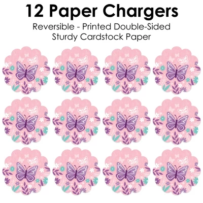 Beautiful Butterfly Paper Chargers INCLUDES set of 12 reversible round table decorations. Create an exciting look at your Baby Shower or Birthday Party when you use paper chargers to elevate your table setting and accent your dinnerware. Tablescape Accent: Beautiful Butterfly chargers will add a festive flare to your tablescape. Whether it’s a large feast gathering or a close-knit gathering with the family, paper chargers will add a splash of color and are a great alternative to paper doilies. Easy Decor: Dress up your table with layers! Add a plate to the center of paper chargers. Floral Themed paper charger is an easy solution for your table setting decor and perfect for complementing your tableware. The scallop border can be flared up for an elevated look and the backside can be used for an alternate look. High-Quality Supply: Beautiful Butterfly Paper Chargers are professionally printed double-sided on sturdy cardstock paper with a photo-like shine. Paper chargers measure 11.25” in diameter and are the perfect final touch to complete your Baby Shower or Birthday Party. Made In The USA: Beautiful Butterfly Paper Chargers are designed and manufactured at our Wisconsin facility using materials that are Made in the USA.