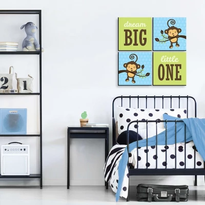 Blue Monkey Boy Wall Art Set INCLUDES 4 ready-to-hang blue boy monkey themed panels and non-marking wall mounts for easy hanging. Blue Monkey Boy artwork is perfect for a nursery, kids room or playroom. Blue Monkey Boy Wall Art & Kids Room Decor SIZE each 11 inches high x 11 inches wide x .5 inches thick. Boy monkey lightweight art prints will arrive ready to use – no frame needed. The black edge gives each print a modern, finished look. EASY TO HANG: Simply attach a non-marking wall mount (included) to each corner of a Blue Monkey Boy art panel and press to hang in desired location. Wall mounts are repositionable, so you can redesign your artwork display at any time. PREMIUM HOME DECOR: 4-piece Blue Monkey Boy Wall Art Set is professionally printed on thick material with a black edge. You will not need to frame this set of blue, green and brown monkey room decor. Each standout print is ready to hang and will add a contemporary touch to any room. MADE IN THE USA: Blue Monkey Boy – Nursery Wall Art & Kids Room Decor is designed and manufactured at our Wisconsin facility using materials that are Made in the USA.