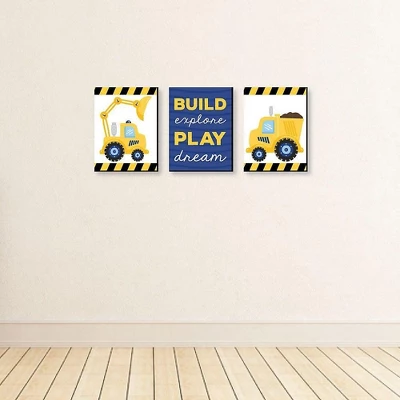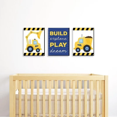Construction Truck Wall Art Set INCLUDES 3 ready-to-hang under construction themed panels and non-marking wall mounts for easy hanging. Construction Truck artwork is perfect for a nursery, kids room or playroom. Construction Truck Wall Art & Kids Room Decor SIZE each 10 inches high x 7.5 inches wide x .5 inches thick. Construction site lightweight art prints will arrive ready to use – no frame needed. The black edge gives each print a modern, finished look. EASY TO HANG: Simply attach a non-marking wall mount (included) to each corner of a Construction Truck art panel and press to hang in desired location. Wall mounts are repositionable, so you can redesign your artwork display at any time. PREMIUM HOME DECOR: 3-piece Construction Truck Wall Art Set is professionally printed on thick material with a black edge. You will not need to frame this set of construction zone room decor. Each standout print is ready to hang and will add a contemporary touch to any room. MADE IN THE USA: Construction Truck Nursery Wall Art & Kids Room Decor is designed and manufactured at our Wisconsin facility using materials that are Made in the USA.