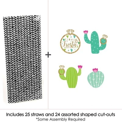 Final Fiesta Straw Decor INCLUDES 24 cactus and ring paper cut outs, 24 coordinating paper straws & 40 clear stickers for easy assembly. Final Fiesta DIY party supplies are perfect for a bachelorette party. Cactus and Ring Straw Decor party kit SIZE 6 ring paper die cuts (2.5″ X 2.75″), 6 cactus paper die cuts (2″ X 2.5″); 6 cactus paper die cuts (2.75″ X 2.75″); 6 cactus paper die cuts (2.75″ X 2.5″) and 24 chevron striped paper straws 7.75″ tall. EASY PARTY DECORATIONS: Final Fiesta straw decor will add a touch of charm to your bachelorette party tables. Final Fiesta straw decor will also look great at your beverage bar. Use these adorable last fiesta party accessories as straws or swizzle sticks. The paper straws can also be cut in half and used as cupcake picks once the shaped cut out is attached. PREMIUM PARTY SUPPLIES: Final Fiesta paper cut out straw decorations are professionally printed on heavy-duty card stock paper with a photo-like shine. They are individually inspected and carefully packaged by hand, along with coordinating paper straws. Mexican Fiesta Straw Decor will require some easy assembly. Simply adhere the shaped cut outs to the straws using the included clear stickers. Get creative with your DIY bachelorette party decoration ideas! Please Note: Mason Jars shown for display purposes and are not included. Final Fiesta – Bachelorette Party Striped Decorative Straws use a No-Mess Glitter Print: Our wrappers are designed with a printed image of glitter, eliminating glitter flake while maximizing bling effect!