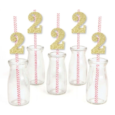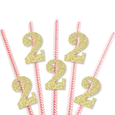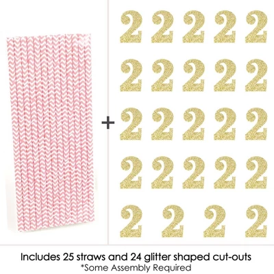 Gold Glitter 2 Party Straws INCLUDES 24 no-mess real gold glitter cut-out number 2s, 24 pink party straws and adhesives. Party straw decor is ideal for a 2nd birthday party. PERFECT PARTY DECORATIONS: Gold Glitter 2 cut-out numbers come in a set of 24 MEASURE 1.5 inches x 2.25 inches, paper party straws MEASURE 7.75 inches tall. Real gold glitter number 2 gold straw decor is cut from no-mess glitter paper, making them perfect beverage straw, drink marker, swizzle stick or food pick. EASY TO USE: No-mess shaped cut out glitter confetti easily attaches to the fun party straws with the included adhesive stickers. Gold Glitter 2 Party Straws – No-Mess Real Gold Glitter Cut-Out Numbers & Decorative Paper Straws are quick to assemble for your 2nd birthday party. HIGH-QUALITY: Gold Glitter 2 Cut-Out Numbers are professionally cut from heavy-duty, cardstock glitter paper. They are then inspected for quality while being carefully hand-packed in sets of 24 along with 24 striped paper straws. Gold glitter 2 number confetti uses NO-MESS Real Gold Glitter Paper with white reverse side, eliminating glitter flake while maximizing bling effect! Please Note: Glasses shown for display purposes and are not included.