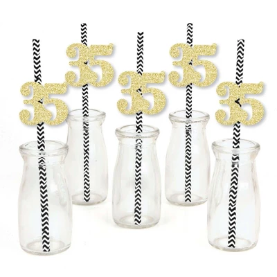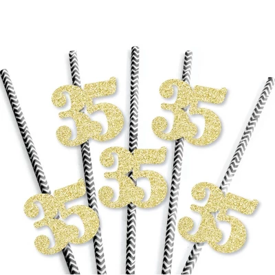 Gold Glitter 35 Party Straws INCLUDES 24 no-mess real gold glitter cut-out number 35s, 24 black party straws and adhesives. Party straw decor is ideal for a 35th birthday party or anniversary party. PERFECT PARTY DECORATIONS: Gold Glitter 35 cut-out numbers come in a set of 24 MEASURE 2.25 inches x 2 inches, paper party straws MEASURE 7.75 inches tall. Real gold glitter number 35 gold straw decor is cut from no-mess glitter paper, making them perfect beverage straw, drink marker, swizzle stick or food pick. EASY TO USE: No-mess shaped cut out glitter confetti easily attaches to the fun party straws with the included adhesive stickers. Gold Glitter 35 Party Straws – No-Mess Real Gold Glitter Cut-Out Numbers & Decorative Paper Straws are quick to assemble for your 35th birthday party or anniversary celebration. HIGH-QUALITY: Gold Glitter 35 Cut-Out Numbers are professionally cut from heavy-duty, cardstock glitter paper. They are then inspected for quality while being carefully hand-packed in sets of 24 along with 24 striped paper straws. Gold glitter 35 number confetti uses NO-MESS Real Gold Glitter Paper with white reverse side, eliminating glitter flake while maximizing bling effect! Please Note: Glasses shown for display purposes and are not included.
