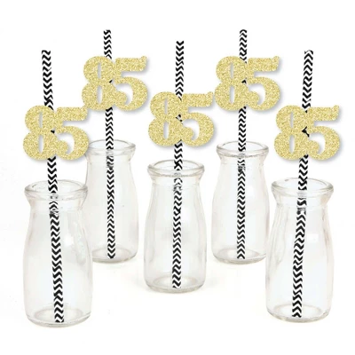 Gold Glitter 85 Party Straws INCLUDES 24 no-mess real gold glitter cut-out number 85s, 24 black party straws and adhesives. Party straw decor is ideal for an 85th birthday party or anniversary party. PERFECT PARTY DECORATIONS: Gold Glitter 85 cut-out numbers come in a set of 24 MEASURE 2.25 inches x 2 inches, paper party straws MEASURE 7.75 inches tall. Real gold glitter number 85 gold straw decor is cut from no-mess glitter paper, making them perfect beverage straw, drink marker, swizzle stick or food pick. EASY TO USE: No-mess shaped cut out glitter confetti easily attaches to the fun party straws with the included adhesive stickers. Gold Glitter 85 Party Straws – No-Mess Real Gold Glitter Cut-Out Numbers & Decorative Paper Straws are quick to assemble for your 85th birthday party or anniversary celebration. HIGH-QUALITY: Gold Glitter 85 Cut-Out Numbers are professionally cut from heavy-duty, cardstock glitter paper. They are then inspected for quality while being carefully hand-packed in sets of 24 along with 24 striped paper straws. Gold glitter 85 number confetti uses NO-MESS Real Gold Glitter Paper with white reverse side, eliminating glitter flake while maximizing bling effect! Please Note: Glasses shown for display purposes and are not included.