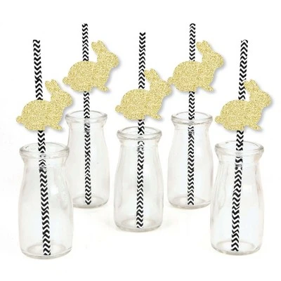 Gold Glitter Bunnies Party Straws INCLUDES 24 no-mess real gold glitter cut-out shape bunny, 24 black party straws and adhesives. Party straw decor is ideal for an Easter party. PERFECT PARTY DECORATIONS: Gold Glitter bunny cut-out shapes come in a set of 24 MEASURE 2 inches x 2 inches, paper party straws MEASURE 7.75 inches tall. Real gold glitter number bunny gold straw decor is cut from no-mess glitter paper, making them perfect beverage straw, drink marker, swizzle stick or food pick. EASY TO USE: No-mess shaped cut out glitter confetti easily attaches to the fun party straws with the included adhesive stickers. Gold Glitter Bunny Party Straws – No-Mess Real Gold Glitter Cut-Out & decorative Paper Straws are quick to assemble for your Easter party celebration. HIGH-QUALITY: Gold Glitter Bunny Cut-Out shapes are professionally cut from heavy-duty, cardstock glitter paper. They are then inspected for quality while being carefully hand-packed in sets of 24 along with 24 striped paper straws. Gold glitter bunny shape confetti uses NO-MESS Real Gold Glitter Paper with white reverse side, eliminating glitter flake while maximizing bling effect! Please Note: Glasses shown for display purposes and are not included.