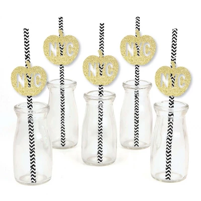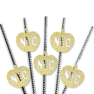 Big Dot Of Happiness Gold Glitter NYC Apple Party Straws – No-Mess Real Glitter Cut-Outs And Decorative New York City Party Paper Straws – Set Of 24
