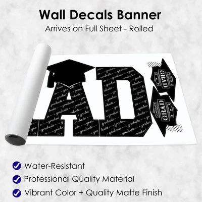 Graduation Cheers Standard Banner Wall Decals include 1 sheet of vinyl sticker letters that spell “Grad” and 2 grad cap shapes that will look great as part of your Graduation Party decorations. Wall Decal sheet measures 50 inches wide by 16.5 inches tall. Pieces range in size from 11.75 x 15.75 inches to 9.25 x 5.25 inches. Effortless Decor: Hang the Graduation Cheers letters next to each other to form a party banner. They can be hung vertically or horizontally and will add some extra charm to your party space within minutes! Use the wall decal banner at your entryway, over the food table, or on a photo booth backdrop. Easy to Use: Graduation Cheers vinyl decals are easy-to-peel and repositionable. Wall art stickers will adhere to various surfaces including painted walls, plastic, wood, glass, and metal. To use, make sure your surface is clean and dry. Slowly peel the sticker from the paper to avoid tearing and smooth over with your hand. They are also easy to remove, leaving no residue. High-Quality Supply: Graduation Cheers wall stickers come with a quality matte finish and vibrant colors. They are printed on water-resistant professional quality material and will arrive on one full sheet rolled. Made In The USA: Graduation Cheers Wall Decals are designed and manufactured at our Wisconsin facility using materials that are Made in the USA.
