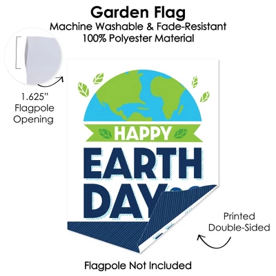 Happy Earth Day Garden Flag INCLUDES 1 polyester fabric material garden flag in a vertical pennant shape that measures 12 inches wide and 15.25 inches tall. (Flagpole Not Included) Cute Decor: Welcome houseguests with this weather resistant Happy Earth Day Garden Flag. Printed double-sided, Save The Planet – Earth Day Party Garden Flag looks great placed close to your home, added to flowerpots, or displayed next to your favorite garden gnome decoration. Yard & Home: Happy Earth Day Garden Flag is machine washable and fade-resistant, allowing you to easily display in your outdoor lawn or inside your home for a fun Earth Day Celebration decoration. The small and cute size helps make this a great housewarming gift for a loved one’s deck, patio, porch, or yard. High-Quality Supply: Happy Earth Day Garden Flag is professionally printed double-sided on 100% polyester material. With a 1.625-inch flagpole opening, easily & quickly display the vibrant Save The Planet Garden Flag. Please Note: Flagpole Not Included – will fit most standard-sized garden flag stand flagpoles. Printed In The USA: Happy Earth Day outdoor lawn and home Garden Flag is designed and manufactured at our Wisconsin facility using materials that are Printed in the USA – Fabric Flag Made in China.