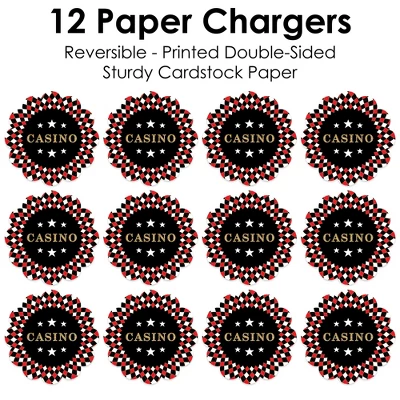 Las Vegas Paper Chargers INCLUDES set of 12 reversible round table decorations. Create an exciting look at your Prom, Retirement, or Birthday Party when you use paper chargers to elevate your table setting and accent your dinnerware. Tablescape Accent: Las Vegas chargers will add a festive flare to your tablescape. Whether it’s a large feast gathering or a close-knit gathering with the family, paper chargers will add a splash of color and are a great alternative to paper doilies. Easy Decor: Dress up your table with layers! Add a plate to the center of paper chargers. Casino Themed paper charger is an easy solution for your table setting decor and perfect for complementing your tableware. The scallop border can be flared up for an elevated look and the backside can be used for an alternate look. High-Quality Supply: Las Vegas Paper Chargers are professionally printed double-sided on sturdy cardstock paper with a photo-like shine. Paper chargers measure 11.25” in diameter and are the perfect final touch to complete your Prom, Retirement, or Birthday Party. Made In The USA: Las Vegas Paper Chargers are designed and manufactured at our Wisconsin facility using materials that are Made in the USA. Las Vegas Paper Chargers uses a No-Mess Glitter Print: Our Paper Chargers are designed with a printed image of glitter, eliminating glitter flake while maximizing bling effect!