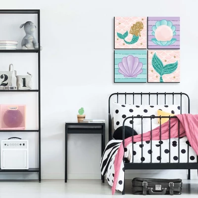 Let’s Be Mermaids Wall Art Set INCLUDES 4 ready-to-hang mermaid themed panels and non-marking wall mounts for easy hanging. Let’s Be Mermaids artwork is perfect for home decor. Let’s Be Mermaids Kids Room, Nursery Decor and Home Decor SIZE each 10 inches high x 7.5 inches wide x .5 inches thick. Mermaid lightweight art prints will arrive ready to use – no frame needed. The black edge gives each print a modern, finished look. EASY TO HANG: Simply attach a non-marking wall mount (included) to each corner of a Let’s Be Mermaids art panel and press to hang in desired location. Wall mounts are repositionable, so you can redesign your artwork display at any time. PREMIUM HOME DECOR: 4-piece Let’s Be Mermaids Wall Art Set is professionally printed on thick material with a black edge. You will not need to frame this set of Mermaid room decor. Each standout print is ready to hang and will add a contemporary touch to any room. MADE IN THE USA: Let’s Be Mermaids Room Decor is designed and manufactured at our Wisconsin facility using materials that are Made in the USA. Mermaid wall decor uses a No-Mess Glitter Print: Our artwork is designed with a printed image of glitter, eliminating glitter flake while maximizing bling effect!