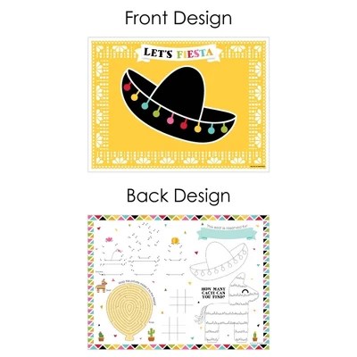 Activity Placemats INCLUDE 16 Let’s Fiesta-themed paper activity placemats for kids. EASY CLEAN UP: Let’s Fiesta paper placemats SIZE 15.5 inches wide x 11.5 high. Made of sturdy cardstock paper, these disposable placemats will make it easy to clean up after the party is over. Party placemats are perfect for at-home dining tables and easy decoration to bring to your favorite restaurant. FUN PARTY ENTERTAINMENT: Activity Placemats are a fun and easy way to keep kids entertained! Each placemat coloring sheet includes matching activities and games. Perfect kids’ activity and party decoration for a Let’s Fiesta birthday party. PAPER PLACEMATS: Let’s Fiesta placemats are professionally printed double-sided on sturdy cardstock paper. Front side features our Let’s Fiesta theme design with a photo-like shine. Flip the placemat over for kid friendly activities. Each placemat is individually inspected and carefully packaged by hand. MADE IN THE USA: Let’s Fiesta paper coloring sheets and activity placemats are designed and manufactured at our Wisconsin facility using materials that are Made in the USA.