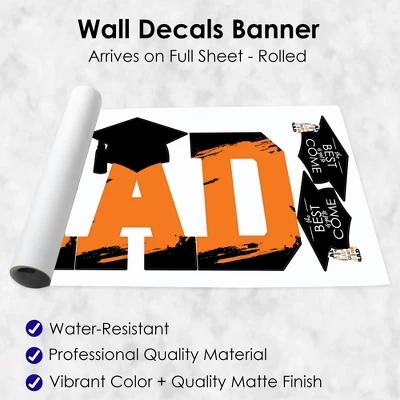Orange Grad – Best is Yet to Come Standard Banner Wall Decals include 1 sheet of vinyl sticker letters that spell “Grad” and 2 grad cap shapes that will look great as part of your Graduation Party decorations. Wall Decal sheet measures 50 inches wide by 16.5 inches tall. Pieces range in size from 11.75 x 15.75 inches to 9.25 x 5.25 inches. Effortless Decor: Hang the Orange Grad – Best is Yet to Come letters next to each other to form a party banner. They can be hung vertically or horizontally and will add some extra charm to your party space within minutes! Use the wall decal banner at your entryway, over the food table, or on a photo booth backdrop. Easy to Use: Orange Grad – Best is Yet to Come vinyl decals are easy-to-peel and repositionable. Wall art stickers will adhere to various surfaces including painted walls, plastic, wood, glass, and metal. To use, make sure your surface is clean and dry. Slowly peel the sticker from the paper to avoid tearing and smooth over with your hand. They are also easy to remove, leaving no residue. High-Quality Supply: Orange Grad – Best is Yet to Come wall stickers come with a quality matte finish and vibrant colors. They are printed on water-resistant professional quality material and will arrive on one full sheet rolled. Made In The USA: Orange Grad – Best is Yet to Come Wall Decals are designed and manufactured at our Wisconsin facility using materials that are Made in the USA.