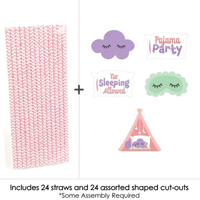 Pajama Slumber Party Straw Decor INCLUDES 24 Pillow Fight & Blanket Fort Themed paper cut outs, 24 coordinating paper straws, and 40 clear stickers for easy assembly. Pajama Slumber Party DIY party supplies are perfect for a Girls Sleepover Birthday Party. Pastel Purple & Pink Jammies Straw Decor party kit SIZE 6 – Purple Sleepy Cloud Shape 1 Paper Die Cuts (3” x 2”), 6 – Green Sleep Mask Shape 2 Paper Die Cuts (3” x 1.75”), 3 – “Pajama Party” Pillow Shape 3 Paper Die Cuts (3” x 2”), 6 – Pink Blanket Fort Tent Shape 4 (3” x 3”), 3 – “No Sleeping Allowed” Pillow Shape 5 (3” x 2”) and 24 chevron striped paper straws 7.75″ tall. EASY PARTY DECORATIONS: Pajama Slumber Party straw decor will add a touch of style to your Girls Sleepover Birthday Party tables. Pretty Girl straw decor will also look great at your beverage bar. Use these adorable Pastel Purple & Pink Jammies party accessories as straws or swizzle sticks. The paper straws can also be cut in half and used as cupcake picks once the shaped cut out is attached. PREMIUM PARTY SUPPLIES: Pajama Slumber Party paper cut out straw decorations are professionally printed on heavy-duty cardstock paper with a photo-like shine. They are individually inspected and carefully packaged by hand, along with coordinating paper straws. Pastel Purple & Pink Jammies Straw Decor will require some easy assembly. Simply adhere the shaped cut outs to the straws using the included clear stickers. Get creative with your DIY Girls Sleepover Birthday Party decoration ideas! Please Note: Mason Jars shown for display purposes and are not included.
