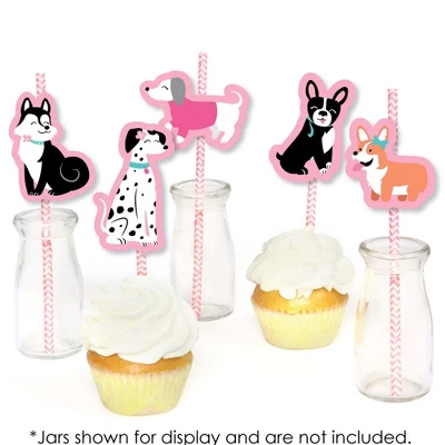 Pawty Like a Puppy Girl Straw Decor INCLUDES 24 dog paper cut outs, 24 coordinating paper straws & 40 clear stickers for easy assembly. Pawty Like a Puppy Girl DIY party supplies are perfect for a baby shower or birthday. Doggie Straw Decor party kit SIZE 5 dog paper die cuts (2.25″ X 3.5″); 5 dog paper die cuts (2.5″ X 2.5″); 5 dog paper die cuts (2.5″ X 3″); 4 dog paper die cuts (3″ X 2.25″); 5 dog paper die cuts (2.5″ X 3″) and 24 chevron striped paper straws 7.75″ tall. EASY PARTY DECORATIONS: Pawty Like a Puppy Girl straw decor will add a touch of style to your baby shower or birthday party tables. Pup straw decor will also look great at your beverage bar. Use these adorable Pawty Like a Puppy Girl party accessories as straws or swizzle sticks. The paper straws can also be cut in half and used as cupcake picks once the shaped cut out is attached. PREMIUM PARTY SUPPLIES: Pawty Like a Puppy Girl paper cut out straw decorations are professionally printed on heavy-duty card stock paper with a photo-like shine. They are individually inspected and carefully packaged by hand, along with coordinating paper straws. Doggie Straw Decor will require some easy assembly. Simply adhere the shaped cut outs to the straws using the included clear stickers. Get creative with your DIY baby shower or birthday party decoration ideas! Please Note: Mason Jars shown for display purposes and are not included.