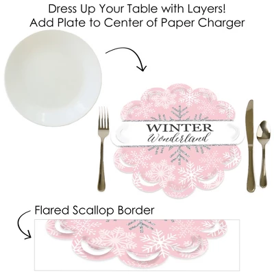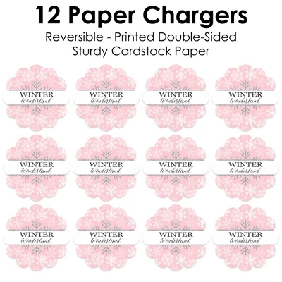 Pink Winter Wonderland Paper Chargers INCLUDES set of 12 reversible round table decorations. Create an exciting look at your Holiday Birthday Party or Baby Shower when you use paper chargers to elevate your table setting and accent your dinnerware. Tablescape Accent: Pink Winter Wonderland chargers will add a festive flare to your tablescape. Whether it’s a large feast gathering or a close-knit gathering with the family, paper chargers will add a splash of color and are a great alternative to paper doilies. Easy Decor: Dress up your table with layers! Add a plate to the center of paper chargers. Snowflake Themed paper charger is an easy solution for your table setting decor and perfect for complementing your tableware. The scallop border can be flared up for an elevated look and the backside can be used for an alternate look. High-Quality Supply: Pink Winter Wonderland Paper Chargers are professionally printed double-sided on sturdy cardstock paper with a photo-like shine. Paper chargers measure 11.25” in diameter and are the perfect final touch to complete your Holiday Birthday Party or Baby Shower. Made In The USA: Pink Winter Wonderland Paper Chargers are designed and manufactured at our Wisconsin facility using materials that are Made in the USA. Pink Winter Wonderland Paper Chargers uses a No-Mess Glitter Print: Our Paper Chargers are designed with a printed image of glitter, eliminating glitter flake while maximizing bling effect!