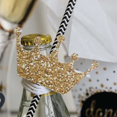 Prom Straw Decor INCLUDES 24 prom paper cut outs, 24 coordinating paper straws & clear stickers for easy assembly. Prom DIY party supplies are perfect for a prom dance or party. Prom Party Straw Decor party kit SIZE 8 prom words 4″ wide x 2″ tall; 8 crowns 3.25″ wide x 2″ tall; 8 bowties 2.75″ wide x 1.25″ tall; and 24 chevron striped paper straws 7.75″ tall. EASY PARTY DECORATIONS: Prom straw decor will add a touch of charm to your prom dance party tables. Prom theme straw decor will also look great at your beverage bar. Use these adorable prom party accessories as straws or swizzle sticks. The paper straws can also be cut in half and used as cupcake picks once the shaped cut out is attached. PREMIUM PARTY SUPPLIES: Prom paper cut out straw decorations are professionally printed on heavy-duty card stock paper with a photo-like shine. They are individually inspected and carefully packaged by hand, along with coordinating paper straws. Prom Straw Decor will require some easy assembly. Simply adhere the shaped cut outs to the straws using the included clear stickers. Get creative with your DIY prom night party decoration ideas! Please Note: Mason Jars shown for display purposes and are not included. Prom Paper Straw Decor – Prom Night Party Striped Decorative Straws use a No-Mess Glitter Print: Our wrappers are designed with a printed image of glitter, eliminating glitter flake while maximizing bling effect!