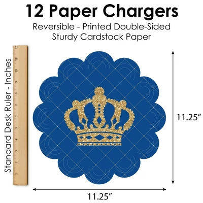 Royal Prince Charming Paper Chargers INCLUDES set of 12 reversible round table decorations. Create an exciting look at your Baby Shower or Birthday Party when you use paper chargers to elevate your table setting and accent your dinnerware. Tablescape Accent: Royal Prince Charming chargers will add a festive flare to your tablescape. Whether it’s a large feast gathering or a close-knit gathering with the family, paper chargers will add a splash of color and are a great alternative to paper doilies. Easy Decor: Dress up your table with layers! Add a plate to the center of paper chargers. Blue & Gold Crown Themed paper charger is an easy solution for your table setting decor and perfect for complementing your tableware. The scallop border can be flared up for an elevated look and the backside can be used for an alternate look. High-Quality Supply: Royal Prince Charming Paper Chargers are professionally printed double-sided on sturdy cardstock paper with a photo-like shine. Paper chargers measure 11.25” in diameter and are the perfect final touch to complete your Baby Shower or Birthday Party. Made In The USA: Royal Prince Charming Paper Chargers are designed and manufactured at our Wisconsin facility using materials that are Made in the USA. Royal Prince Charming Paper Chargers uses a No-Mess Glitter Print: Our Paper Chargers are designed with a printed image of glitter, eliminating glitter flake while maximizing bling effect!