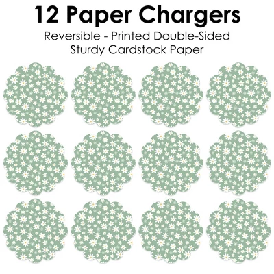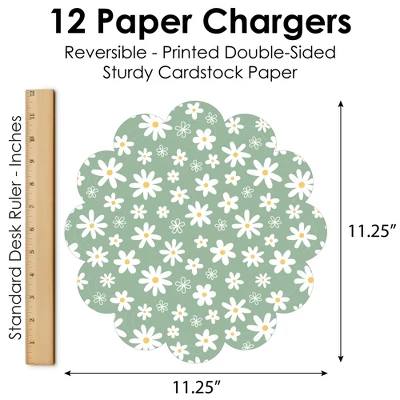 Sage Green Daisy Flowers Paper Chargers INCLUDES set of 12 reversible round table decorations. Create an exciting look at your Floral party when you use paper chargers to elevate your table setting and accent your dinnerware. Tablescape Accent: Sage Green Daisy Flowers chargers will add a festive flare to your tablescape. Whether it’s a large feast gathering or a close-knit gathering with the family, paper chargers will add a splash of color and are a great alternative to paper doilies. Easy Decor: Dress up your table with layers! Add a plate to the center of paper chargers. Boho Floral paper charger is an easy solution for your table setting decor and perfect for complementing your tableware. The scallop border can be flared up for an elevated look and the backside can be used for an alternate look. High-Quality Supply: Sage Green Daisy Flowers Paper Chargers are professionally printed double-sided on sturdy cardstock paper with a photo-like shine. Paper chargers measure 11.25″ in diameter and are the perfect final touch to complete your Floral party. Made In The USA: Sage Green Daisy Flowers Paper Chargers are designed and manufactured at our Wisconsin facility using materials that are Made in the USA.