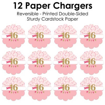 Sweet 16 Paper Chargers INCLUDES set of 12 reversible round table decorations. Create an exciting look at your Birthday Party when you use paper chargers to elevate your table setting and accent your dinnerware. Tablescape Accent: Sweet 16 chargers will add a festive flare to your tablescape. Whether it’s a large feast gathering or a close-knit gathering with the family, paper chargers will add a splash of color and are a great alternative to paper doilies. Easy Decor: Dress up your table with layers! Add a plate to the center of paper chargers. Pretty Pink Themed paper charger is an easy solution for your table setting decor and perfect for complementing your tableware. The scallop border can be flared up for an elevated look and the backside can be used for an alternate look. High-Quality Supply: Sweet 16 Paper Chargers are professionally printed double-sided on sturdy cardstock paper with a photo-like shine. Paper chargers measure 11.25” in diameter and are the perfect final touch to complete your 16th Birthday Party. Made In The USA: Sweet 16 Paper Chargers are designed and manufactured at our Wisconsin facility using materials that are Made in the USA. Sweet 16 Paper Chargers uses a No-Mess Glitter Print: Our Paper Chargers are designed with a printed image of glitter, eliminating glitter flake while maximizing bling effect!