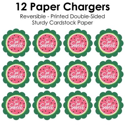 Sweet Watermelon Paper Chargers INCLUDES set of 12 reversible round table decorations. Create an exciting look at your Baby Shower or Birthday Party when you use paper chargers to elevate your table setting and accent your dinnerware. Tablescape Accent: Sweet Watermelon chargers will add a festive flare to your tablescape. Whether it’s a large feast gathering or a close-knit gathering with the family, paper chargers will add a splash of color and are a great alternative to paper doilies. Easy Decor: Dress up your table with layers! Add a plate to the center of paper chargers. Summer Fruit Themed paper charger is an easy solution for your table setting decor and perfect for complementing your tableware. The scallop border can be flared up for an elevated look and the backside can be used for an alternate look. High-Quality Supply: Sweet Watermelon Paper Chargers are professionally printed double-sided on sturdy cardstock paper with a photo-like shine. Paper chargers measure 11.25” in diameter and are the perfect final touch to complete your Baby Shower or Birthday Party. Made In The USA: Sweet Watermelon Paper Chargers are designed and manufactured at our Wisconsin facility using materials that are Made in the USA.