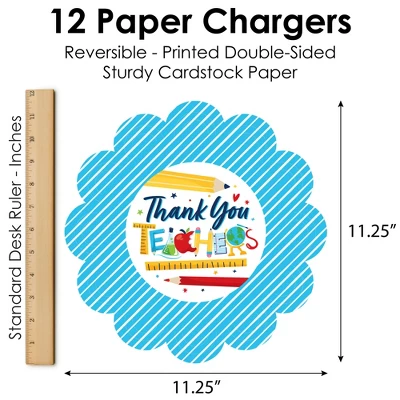 Thank You Teachers Paper Chargers INCLUDES set of 12 reversible round table decorations. Create an exciting look at your Teachers Appreciation when you use paper chargers to elevate your table setting and accent your dinnerware. Tablescape Accent: Thank You Teachers chargers will add a festive flare to your tablescape. Whether it’s a large feast gathering or a close-knit gathering with the family, paper chargers will add a splash of color and are a great alternative to paper doilies. Easy Decor: Dress up your table with layers! Add a plate to the center of paper chargers. Multicolor Themed paper charger is an easy solution for your table setting decor and perfect for complementing your tableware. The scallop border can be flared up for an elevated look and the backside can be used for an alternate look. High-Quality Supply: Thank You Teachers Paper Chargers are professionally printed double-sided on sturdy cardstock paper with a photo-like shine. Paper chargers measure 11.25″ in diameter and are the perfect final touch to complete your Teachers Appreciation. Made In The USA: Thank You Teachers Paper Chargers are designed and manufactured at our Wisconsin facility using materials that are Made in the USA.