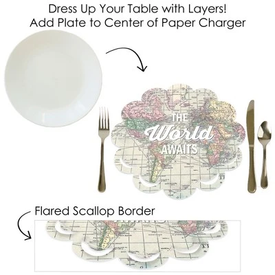 World Awaits Paper Chargers INCLUDES set of 12 reversible round table decorations. Create an exciting look at your Travel Themed Party when you use paper chargers to elevate your table setting and accent your dinnerware. Tablescape Accent: World Awaits chargers will add a festive flare to your tablescape. Whether it’s a large feast gathering or a close-knit gathering with the family, paper chargers will add a splash of color and are a great alternative to paper doilies. Easy Decor: Dress up your table with layers! Add a plate to the center of paper chargers. Travel Themed paper charger is an easy solution for your table setting decor and perfect for complementing your tableware. The scallop border can be flared up for an elevated look and the backside can be used for an alternate look. High-Quality Supply: World Awaits Paper Chargers are professionally printed double-sided on sturdy cardstock paper with a photo-like shine. Paper chargers measure 11.25” in diameter and are the perfect final touch to complete your Travel Themed Party. Made In The USA: World Awaits Paper Chargers are designed and manufactured at our Wisconsin facility using materials that are Made in the USA.